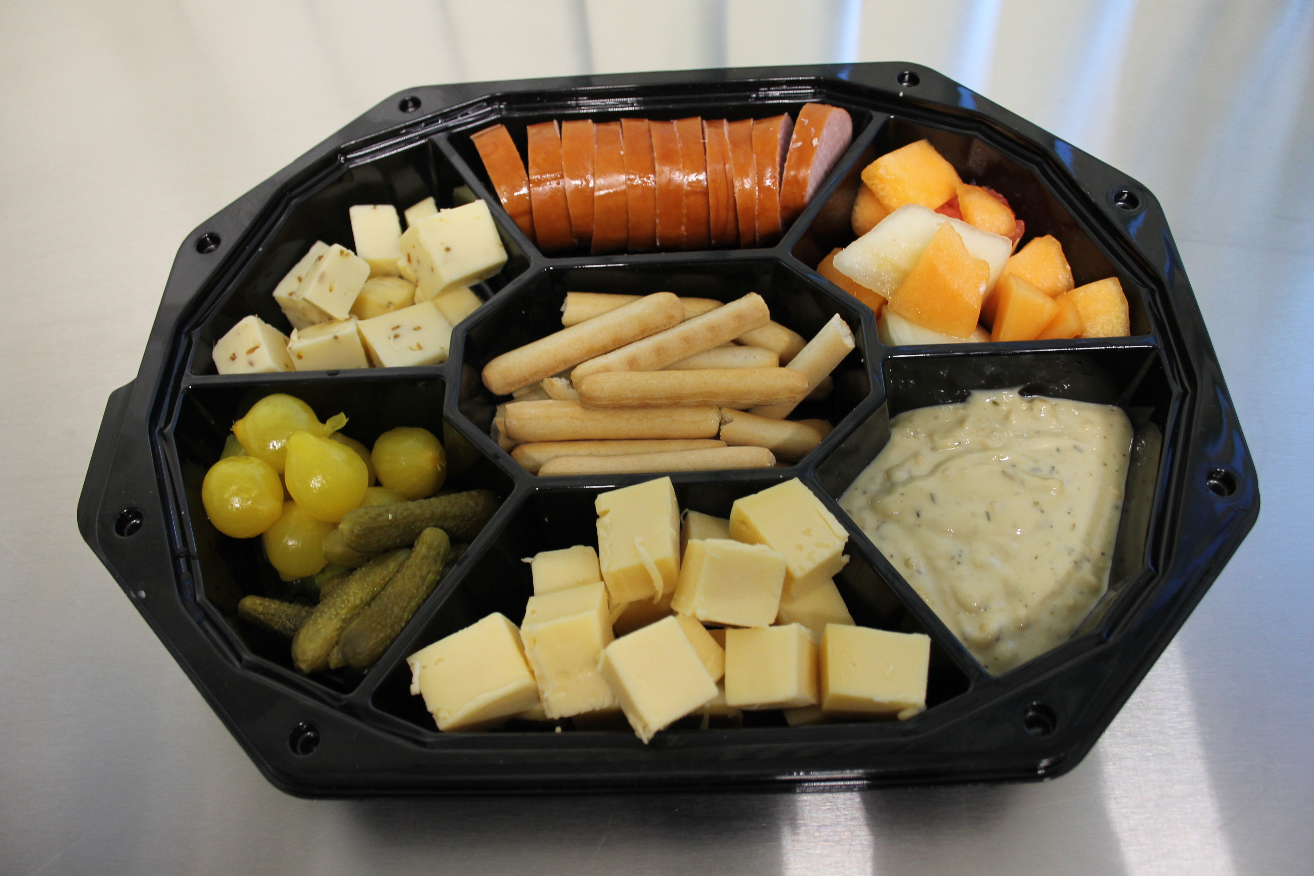 Een luxe schaal met kaas, worst, dip, uitjes, augurk, fruit of komkommertjes, tomaatjes.