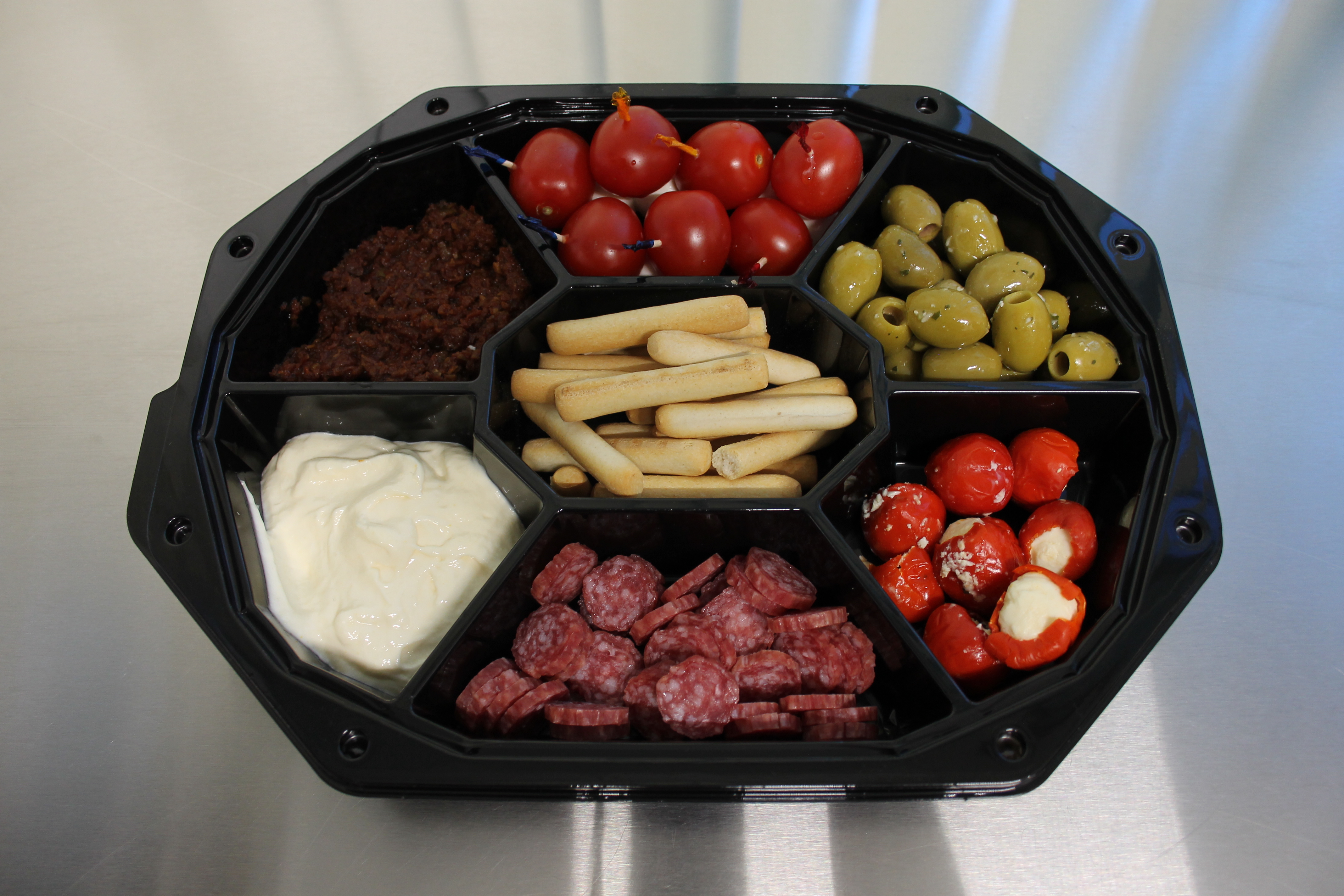 Verschillende hapjes zoals olijven, tomaat/mozzarella, dipjes op een luxe schaal.