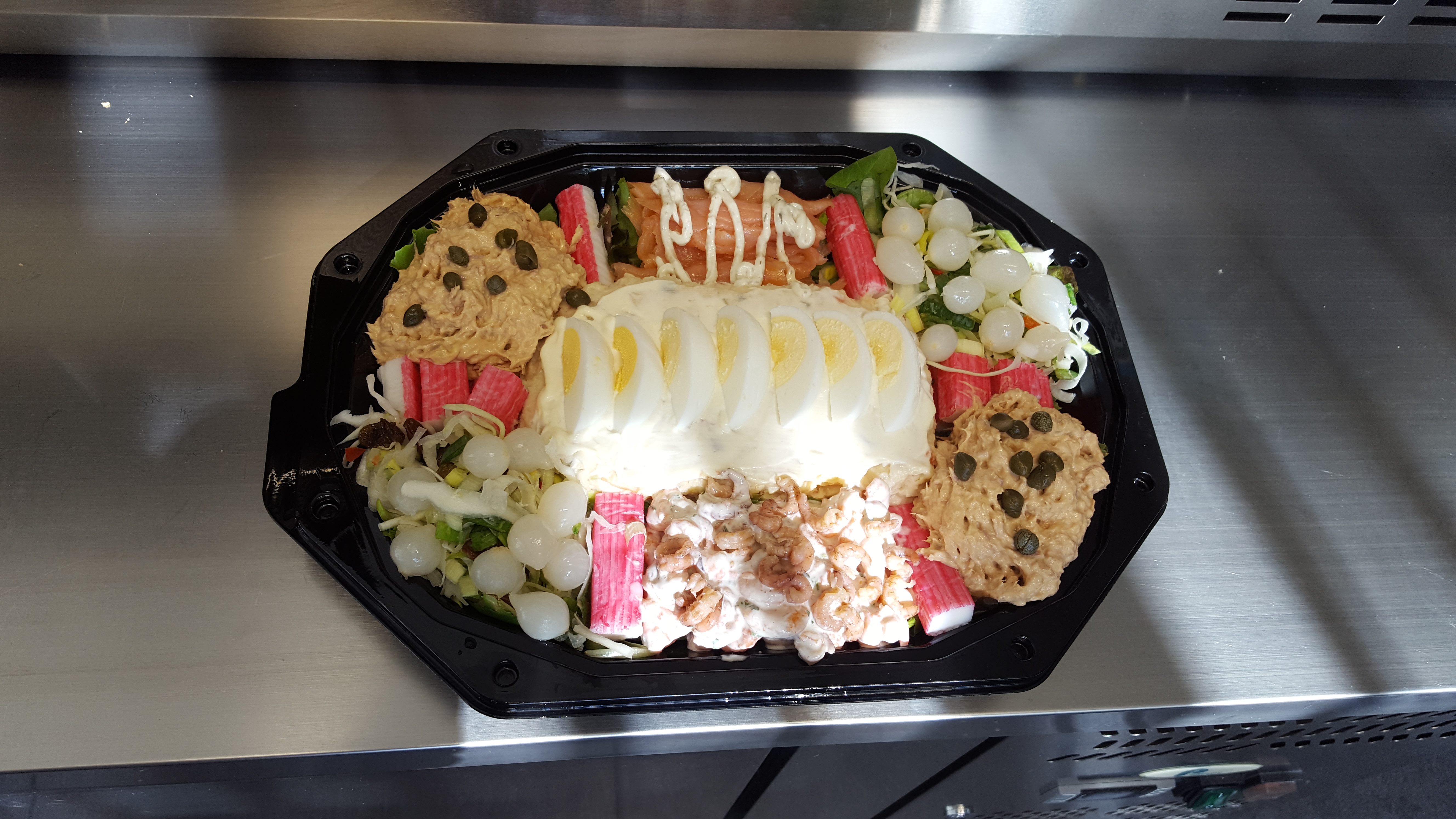 Ingrediënten: Salade, sla, tonijn, garnalen, zalm en garnering.