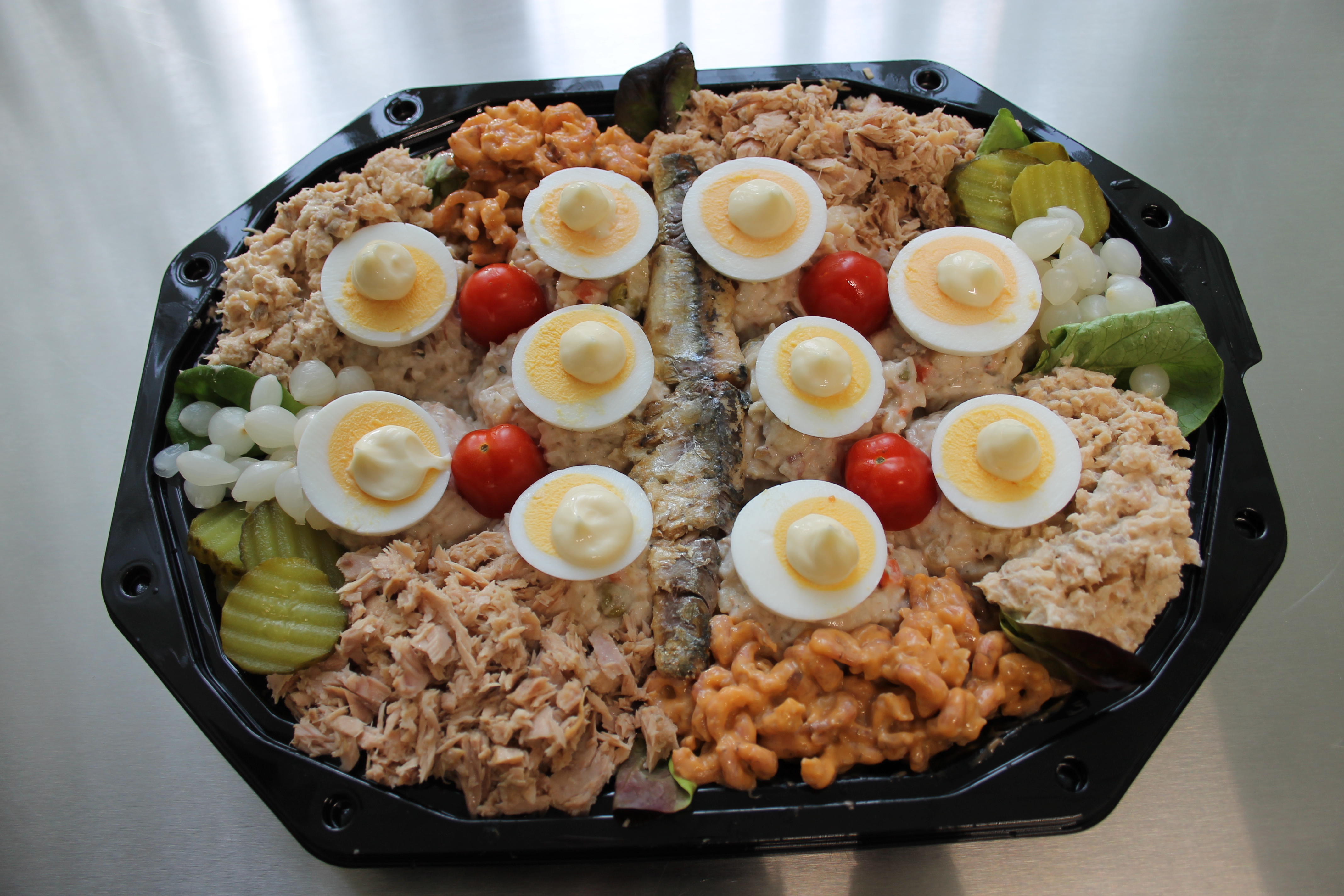 Ingrediënten: Salade, sla, garnalen, tonijn, zalm en garnering. Met brood, toast en kruidenboter.